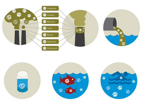 همچنین فلزات سنگین مثل سرب، کادمیم و جیوه از طریق پسماندها و فاضلاب‌های حاوی آنها در صنایع، مراکز خدماتی بهداشتی و درمانی، نساجی‌ها، کارخانه‌های رنگسازی صنایع فلزی آهن و فولاد و صنایع فلزی غیرآهنی، زباله‌ها و پسماندهای حاوی لامپ‌های سوخته و باطری‌های مستعمل و … به محیط زیست راه پیدا می‌کنند. جیوه، سرب و کادمیم از طریق مصرف سوخت‌های فسیلی و یا استفاده از زباله‌سوزهای شهری برای دفع زباله‌ها هوا را نیز آلوده می‌کنند.