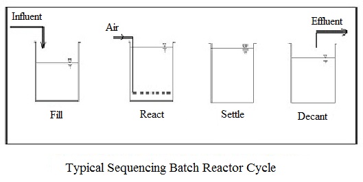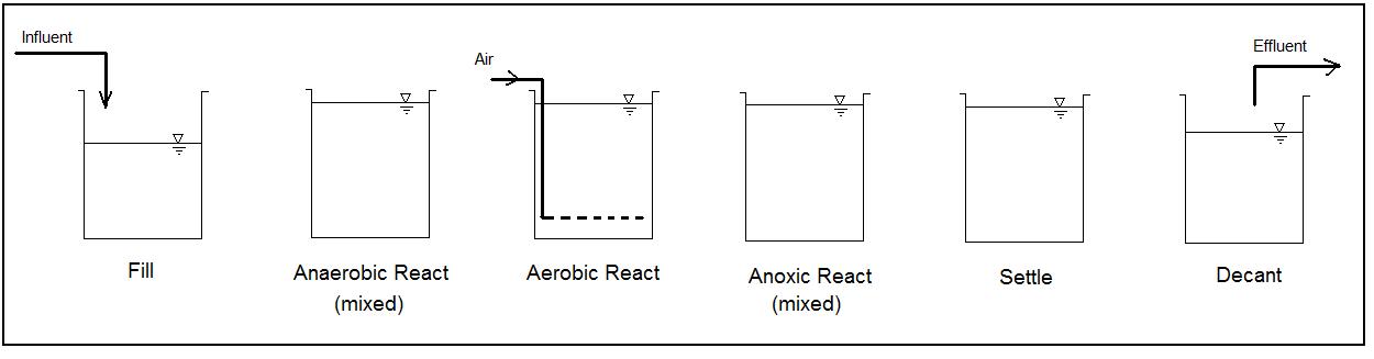 در فرآیند SBR (Sequencing Batch Reactor) از یک راکتور اختلاط کامل که به‌ صورت ناپیوسته فعالیت می‌کند استفاده می‌شود. همه سیستم های SBR به طور معمول ۵ مرحله دارند که به طور پی‌درپی و به صورت شکل زیر انجام می‌گیرند: